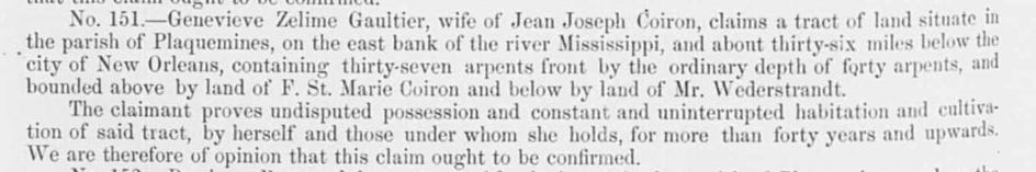 I would also like to recall that Edward Livingston was a next-door neighbor of the Pierre Gautier who lived in Plaquemines Parish. And that decades after Pierre’s death in 1805, Genevieve Zulime Gaultier of Cap Tiburon, Saint-Domingue, claimed what appears to be Pierre’s property, claiming that her family had held the property for more than 40 years. Genevieve and her immediate family were not in Louisiana until around a decade after Pierre’s death in 1805, and it had not been 40 years since they arrived when she made this claim.