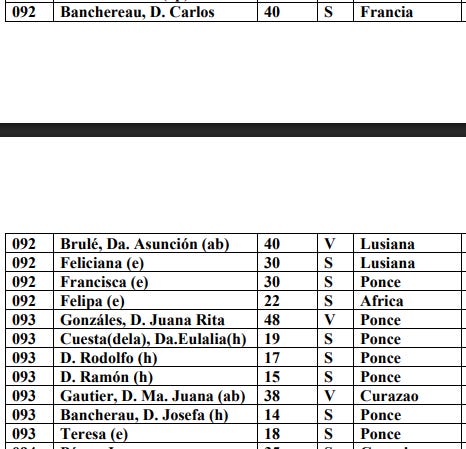 Another exciting find on the Puerto Rican genealogy site was an 1827 census of “Barrio Quemado” in Ponce. The other hacienda Pedro Gautier was associated with was called Hacienda Quemado; presumably this is the same geographic area. This census is fascinating for a lot of reasons… especially interesting is that essentially every family I’ve ever researched because they had connections to both Louisiana and Puerto Rico is found in this one area. But I want to focus on two specific neighboring households.
